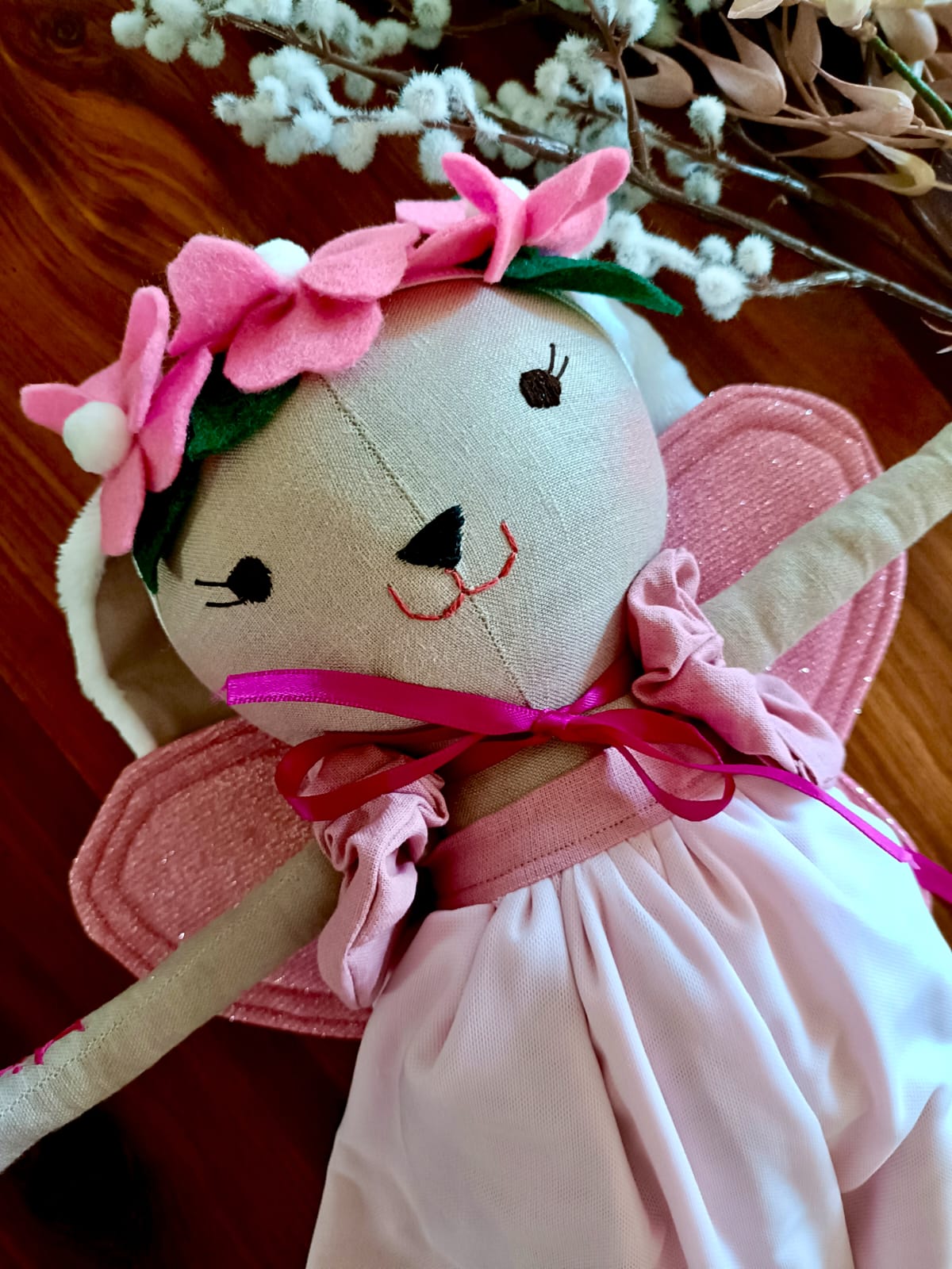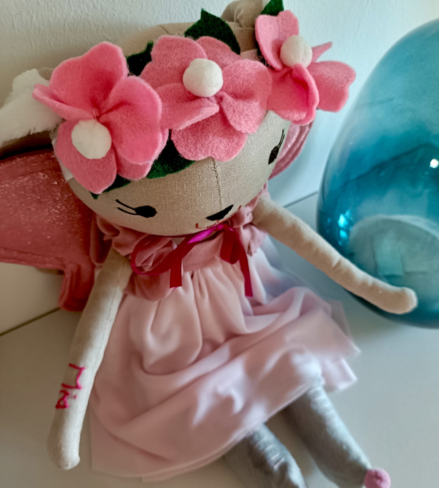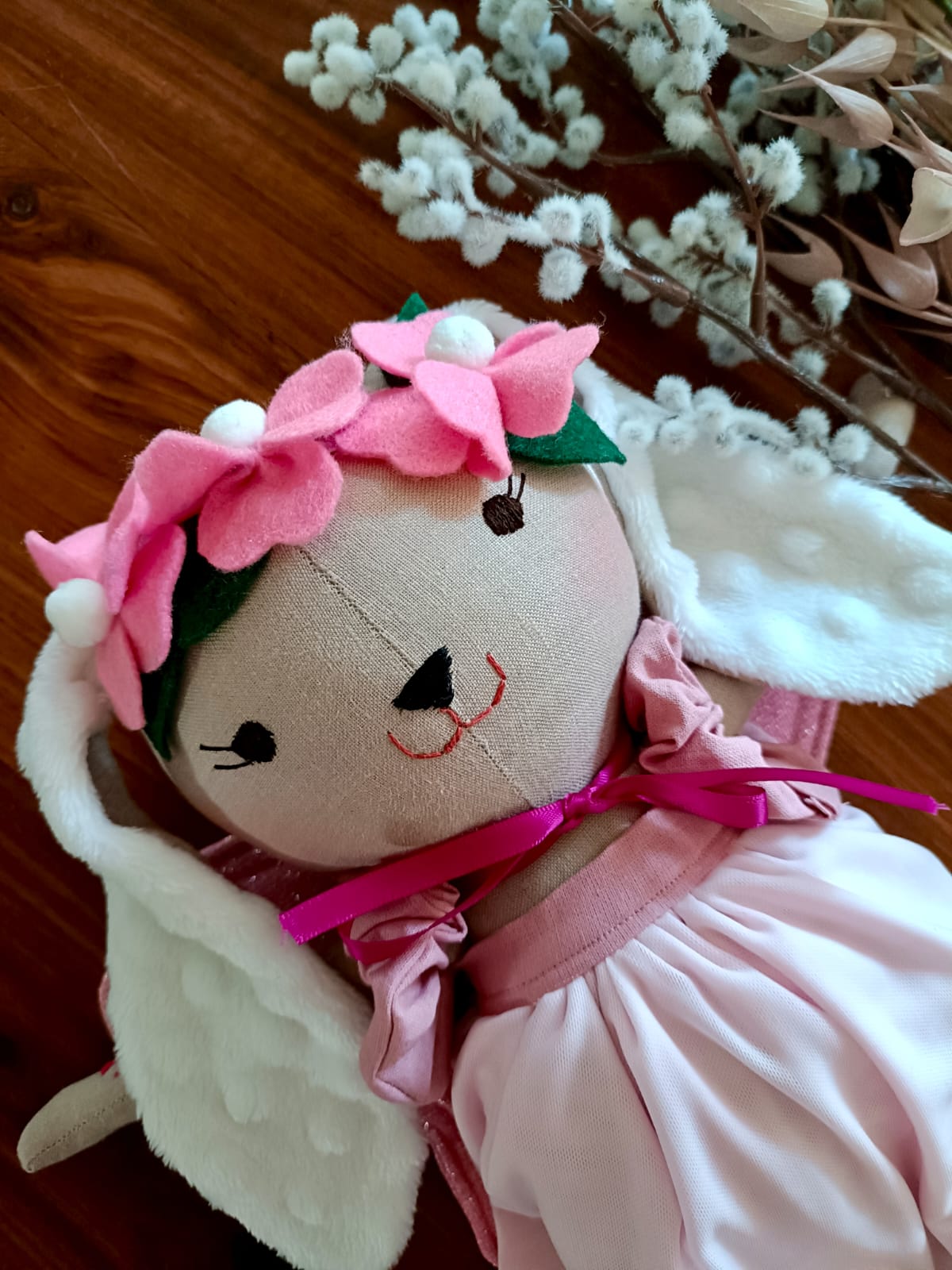 Mia wears a dreamy, fairy-inspired outfit with delicate soft wings, perfect for storytelling, magical adventures, and imaginative play. Every detail — from her outfit to her expressive eyes — is made with love, patience, and creativity.