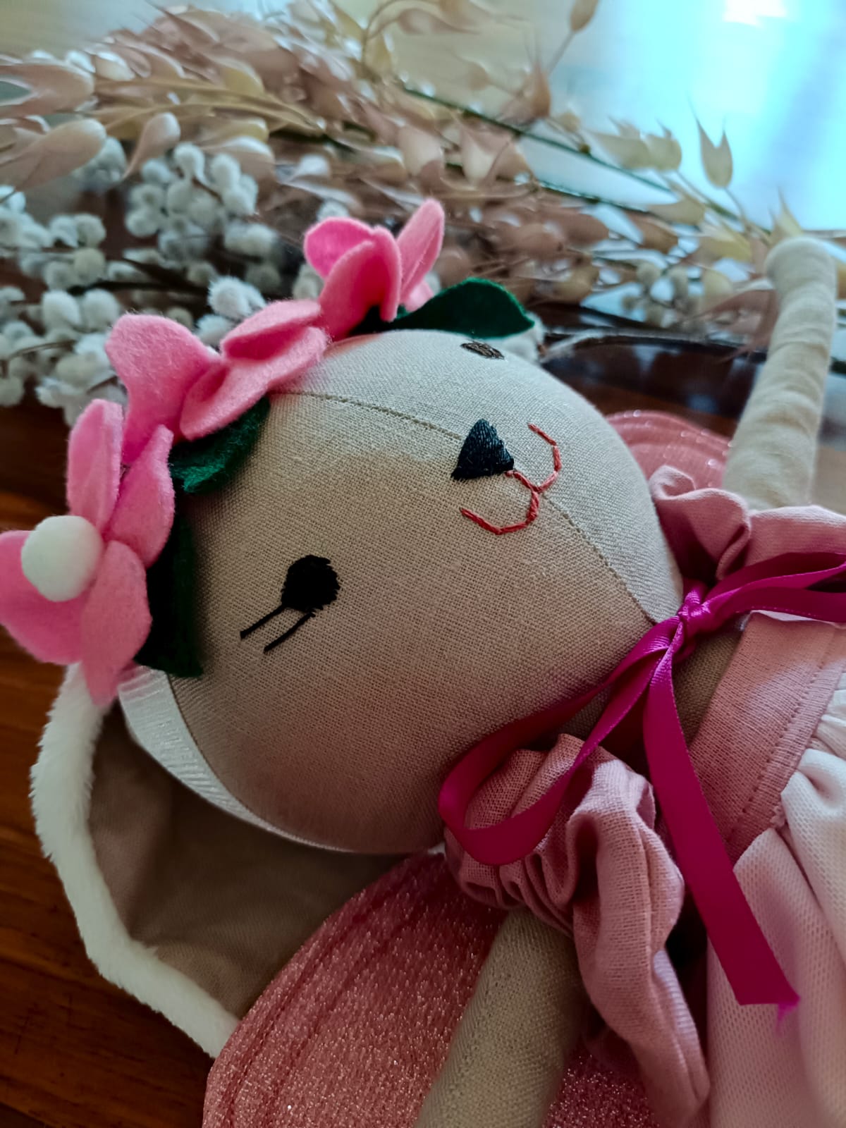Step into a world of wonder with Mia the Faerie Mouse, a 40cm handcrafted doll made from pure Irish linen and softly filled with polyester fiberfill. Her gentle face is brought to life with meticulously hand-embroidered features, giving her a soft, whimsical charm.